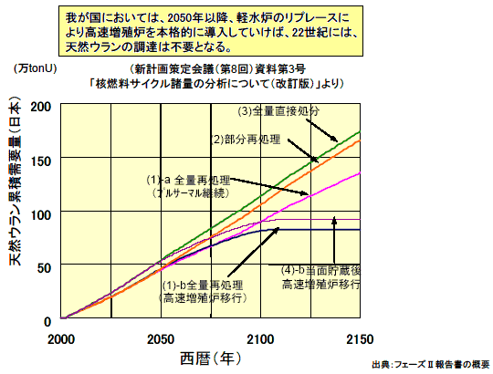そもそも、高速増殖炉サイクルの導入がそれほどうまく行くと考えているのなら、六ヶ所再処理工場を急いで動かして、分離したプルトニウムを軽水炉で燃やすなどというもったいないことをしないで、高速増殖炉の導入時期まで再処理を延期して、分離されたプルトニウムが高速増殖炉で使えるようにすればいい。