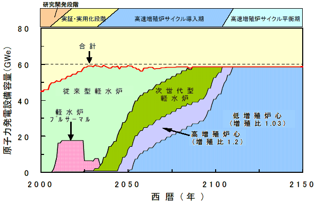 高速増殖炉については、軽水炉核燃料サイクル事業の進捗や「もんじゅ」等の成果に基づいた実用化への取組を踏まえつつ、ウラン需給の動向等を勘案し、経済性等の諸条件が整うことを前提に、2050年頃から商業ベースでの導入を目指す。なお、導入条件が整う時期が前後することも予想されるが、これが整うのが遅れる場合には、これが整うまで改良型軽水炉の導入を継続する。