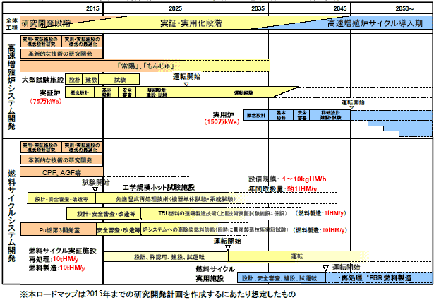 原子力政策大綱 (pdf)(2005年10月閣議決定)は、「高速増殖炉サイクルの適切な実用化像と2050年頃からの商業ベースでの導入に至るまでの段階的な研究開発計画について2015年頃から国としての検討を行う」とし、そのために、国は「実用化戦略調査研究フェーズ II の成果を速やかに評価して、その後の研究開発の方針を提示する」べきだと述べています。
