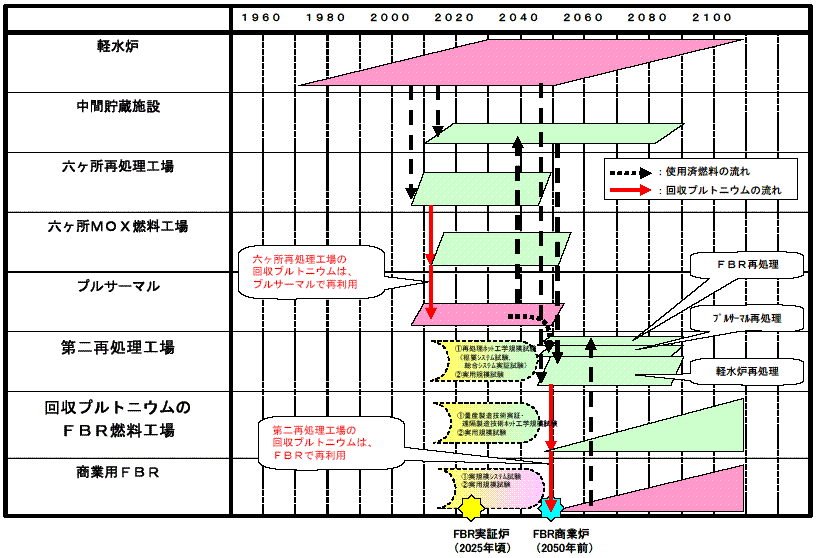 資源エネルギー庁が2005年12月26日に総合資源エネルギー調査会(経産相の諮問機関)電気事業分科会原子力部会に提出した資料『今後の核燃料サイクル実用化のシナリオ(素案)』 (pdf)は、「FBRサイクルへの移行を着実に進める上で、現在の軽水炉による発電やFBR原型炉「もんじゅ」から商業ベースでのFBRサイクルへの移行のシナリオが明確になっていない」と指摘し、「国民や立地地域の理解の得るためには、現在の軽水炉による発電や原型炉「もんじゅ」の段階から、将来の商業ベースでのFBRサイクルの段階への移行のシナリオを国民に提示する必要があるのではないか」と述べ、「ポストもんじゅ」等の関連施設を2030年前後までに設置し、「2050年頃に商業ベースでのFBRの導入を開始し」「六ヶ所再処理工場の操業終了時頃(2045年頃)に第二再処理工場の操業を開始」するとのシナリオを提案していた。