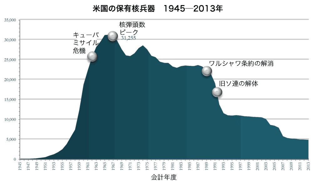 2013年9月現在、米国の保有核兵器は、4804個の核弾頭からなっている。この数は、1967会計年度末[1967年9月30日]の保有核兵器のピーク(3万1255)と比べると85%削減されており、1989年末にベルリンの壁が崩壊した時のレベル(2万2217)と比べると78%の削減となっている。下のグラフは、1945年から2013年9月30日の期間の米国の保有核の量を示している。