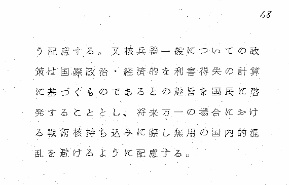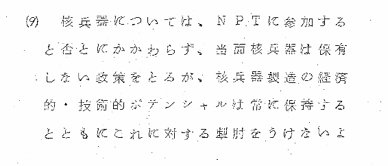 核兵器については、NPTに参加すると否とにかかわらず、当面核兵器は保有しない政策をとるが、核兵器の製造の経済的・技術的ポテンシャルは常に保持するとともにこれに対する掣肘をうけないよう配慮する。又核兵器一般についての政策は国際政治・経済的な利害得失の計算に基づくものであるとの趣旨を国民に啓発することとし、将来万一の場合における戦術核持ち込みに際し無用の国内的混乱を避けるように配慮する。