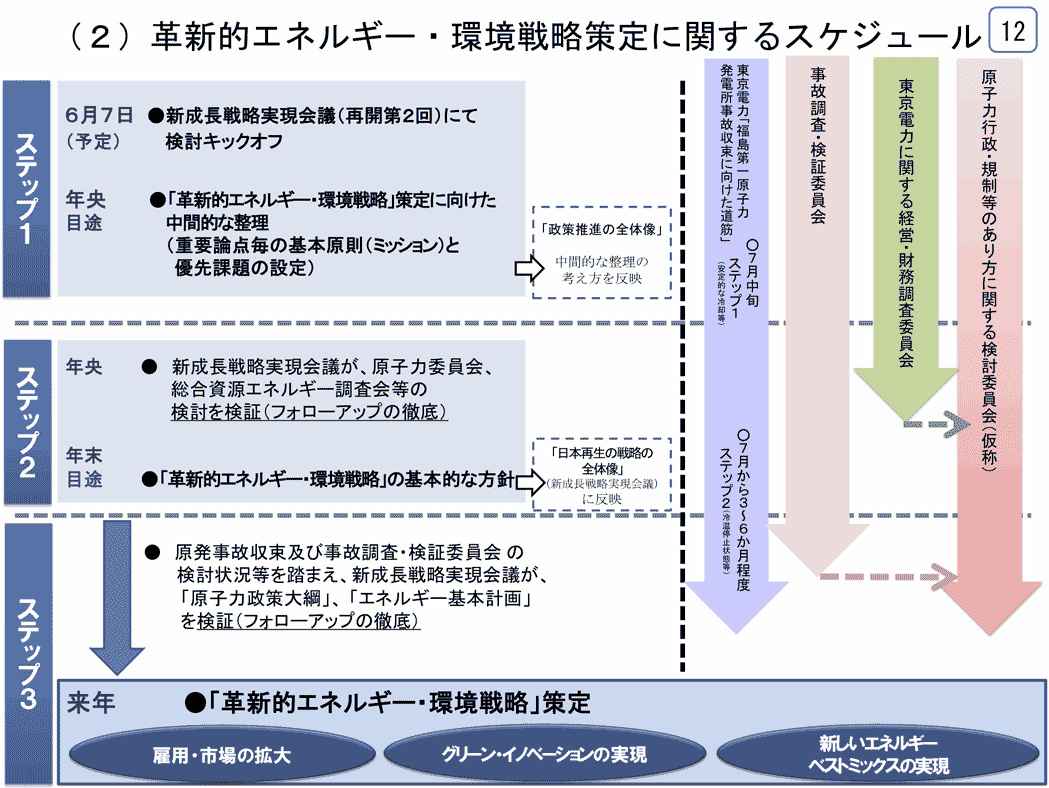 詳細は、12ページ目を御覧いただきたいと思います。第1段階として、年央の7月ぐらいまでに、革新的エネルギー・環境戦略策定に向けた中間的な整理を打ち出してはどうか。
