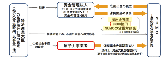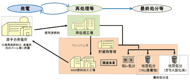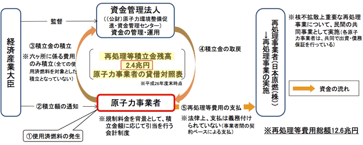 原子力事業者は「原子力発電における使用済燃料の再処理等のための積立金の積立て及び管理に関する法律」に基づき、発電量に応じて、使用済燃料の再処理等の実施に必要な費用の一部を電気料金で回収しこれを積み立て、必要に応じて積立金を取り崩し、現業を行う日本原燃等に対して支払いを行っている