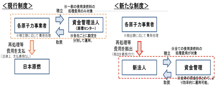 現在の再処理費用積み立て制度は、再処理用資金を外部の「原子力環境整備促進・資金管理センター(原環センター)」に積み立てるもの。原環センターに積み立てられたカネはあくまでも電力会社に属しており、電力会社は取り戻したカネを日本原燃に払う仕組みになっている。法律はこのカネを再処理に使うことを定めてはいないし、自由化で電力会社が潰れた場合、他の借金取りに持って行かれてしまうかもしれないから別の仕組みを考えるべきだというのが経産省の説明である。認可法人なら国が監督できるし、勝手に解散できない。資金の強制徴収権限も付与できる。役員や外部有識者の人事等については、国が承認・認可等を行なえる。国が重要事項に関して一定の命令権限等を持つことにより、新法人の適切な運営の担保を図れる。「認可法人」を立ち上げて再処理実施主体とし、ここに使用済み燃料発生の段階で再処理費用を「拠出」し帰属させる仕組みにすれば、そのカネは認可法人のものとなる。認可法人は、日本原燃に実際の再処理を委託するとの案である。また、「再処理工場での工程と不可分な関連事業(MOX加工事業、廃棄物処分等)の実施に要する費用についても、制度の趣旨に鑑みて拠出金制度の対象とする」という。(再処理で生じる高レベル廃棄物の最終処分については、電力会社が実施主体「原子力発電環境整備機構(原環機構=NUMO)」に拠出し、NUMOがこの資金を原環センターに積み立て、必要に応じて払い戻しを受ける仕組みになっている)。
