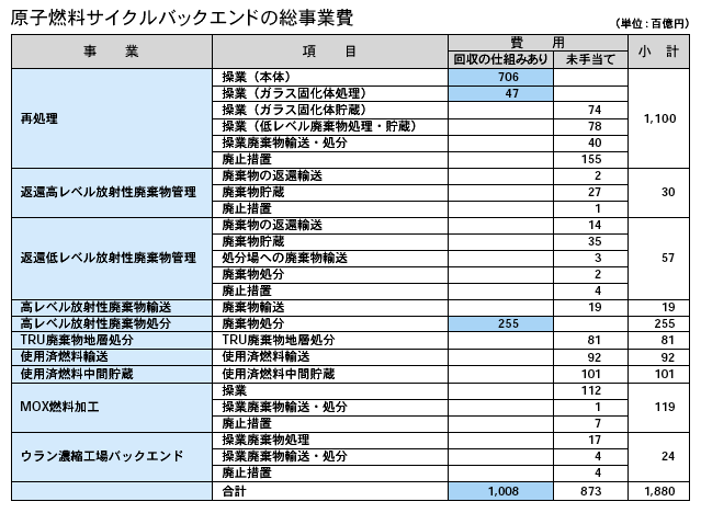 原子力発電の後処理(バックエンド)費用(電気事業連合会) 事業内容 費用(兆円) 再処理工場の操業や廃止など 11.00 海外から返還される高レベル放射性廃棄物の輸送や貯蔵など 0.30 海外から返還される低レベル放射性廃棄物の輸送や処分など 0.57 海外返還分以外の高レベル放射性廃棄物の輸送や処分など 2.74 再処理・MOX燃料工場などで発生する超ウラン元素(TRU)の地層処分 0.81 使用済み燃料の輸送 0.92 使用済み燃料の中間貯蔵 1.01 MOX燃工場の操業や廃止など 1.19 ウラン濃縮工場の後処理 0.24 合計 18.80