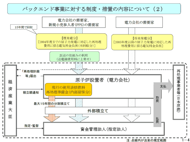既に内部で積み立てられている分については、15年以内に外部積立に移す。 - 既発電分に関する上の追加対象については、15年に渡って分割回収する。自由化で特定規模電気事業者(PPS=Power Producer & Supplier)から電力を購入するようになる消費者からも回収する。電力会社(一般事業者)の送電線を使って特定規模電気事業者の電力を運ぶ「託送」制度を利用し、送電線使用量に上乗せして回収する仕組み。